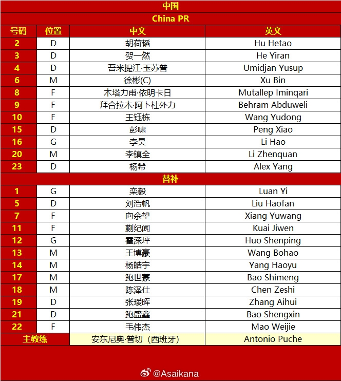 中国U23首发:16-李昊、2-胡荷韬、3-贺一然、4-吾米提江、15-彭啸、23-杨希、6-徐彬、20-李镇全、8-木塔力甫、9-拜合拉木、10-王钰栋