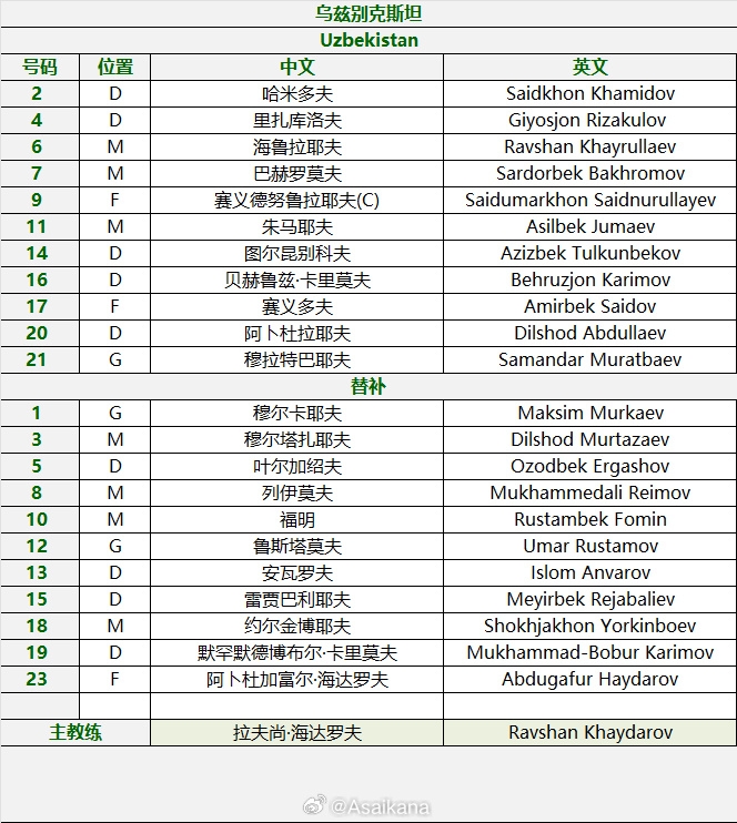 U23乌兹别克斯坦:中场主力伊布赖莫夫累计两黄停赛。